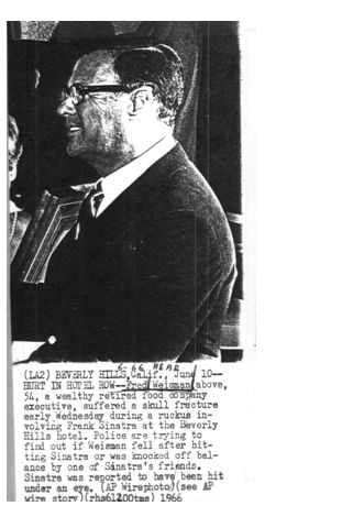 The president of Hunt Foods, Frederick Weisman had a run in with Frank Sinatra and his entourage at the fancy shmancy Polo Lounge, and when it was over, Weisman was in a coma and Frank was talking to the cops. P. 80 in the book has the full story, including details of how Frank’s buddy, singer Dean Martin was overheard yelling, “Let’s get out of here!”