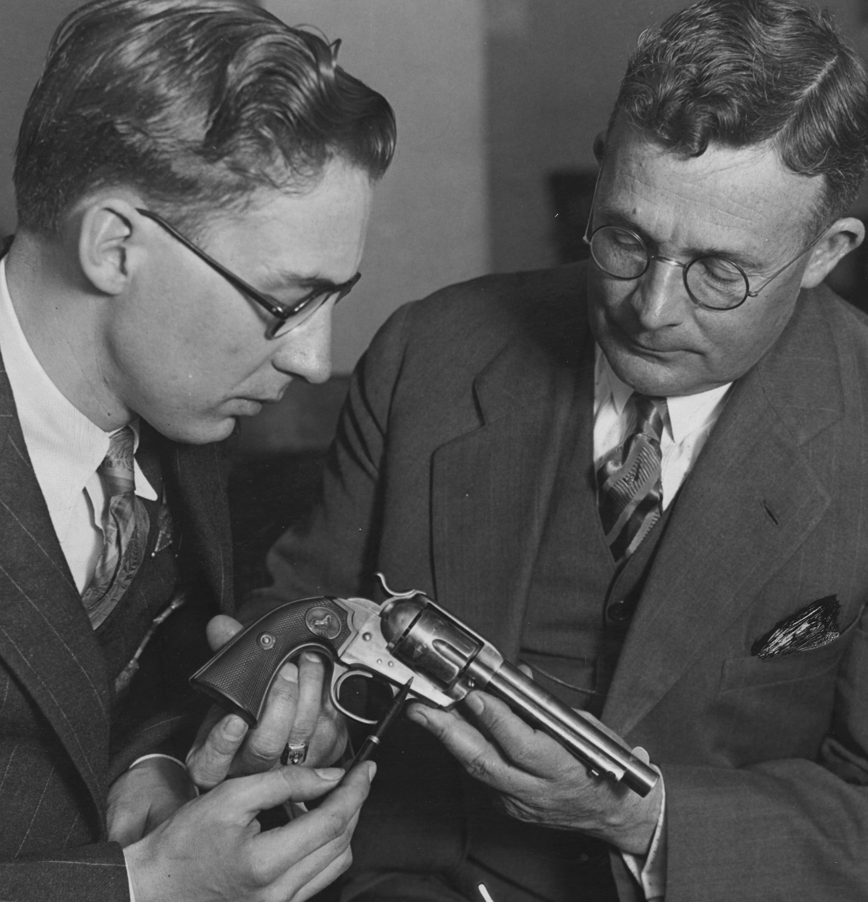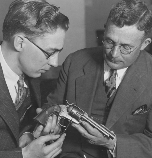 *The smoke and white out you see in the photo were added by newspaper graphic artists to enhance the photo before it was printed. Below is that same gun in the hands of fingerprint expert L.T. White from the district attorney’s office on the left, and investigator Ed King on the right.