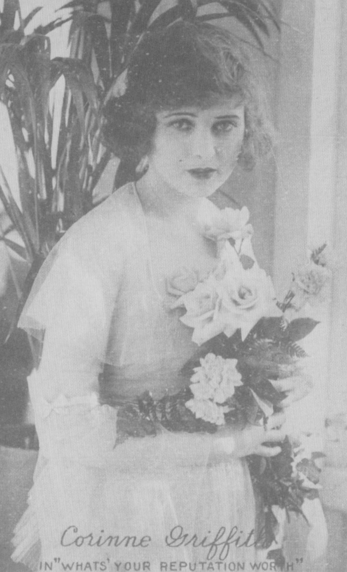 A vintage postcard of Corinne Griffith, who was not a typical star. She didn’t mingle, didn’t socialize with the ‘in crowd.” She was once described as “Haughty and disdainful, she looks at no one but her dogs.” But her keen business skills turned her finances from film into a small fortune. When she died, her estate was worth tens of millions of dollars.