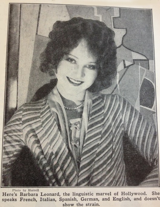 The girl on the cover of our book Beverly Hills Confidential has an ominous message scrawled (or carved?) on her back that reads “Last Warning.” Once we did our detective work, we found out her name was Barbara Leonard, the Lindsay Lohan of her day, getting attention for all the wrong things. (Read more on p. 40) Few photos exist of the actress, here’s a new one we just discovered thanks to a Photoplay magazine shown to us by Richard Adkins, author of “Adrian – American Designer” www.hollywoodandart.com. Thanks for the find!